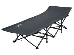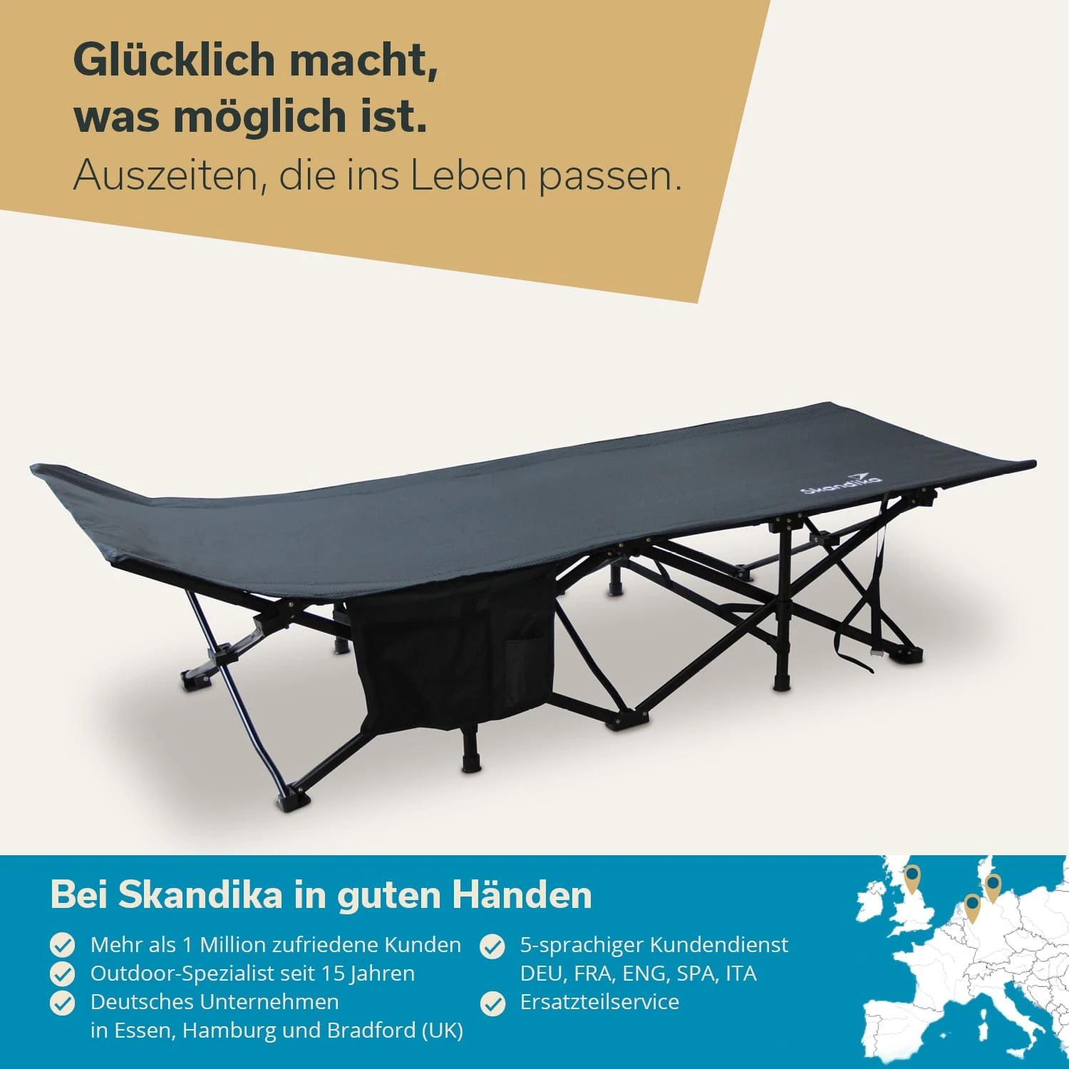 De stevige stalen constructie staat dankzij de antislipvoeten ook op oneffen en natte ondergrond stevig en stevig en verleent het campingbedje een maximale belasting tot 150 kg.