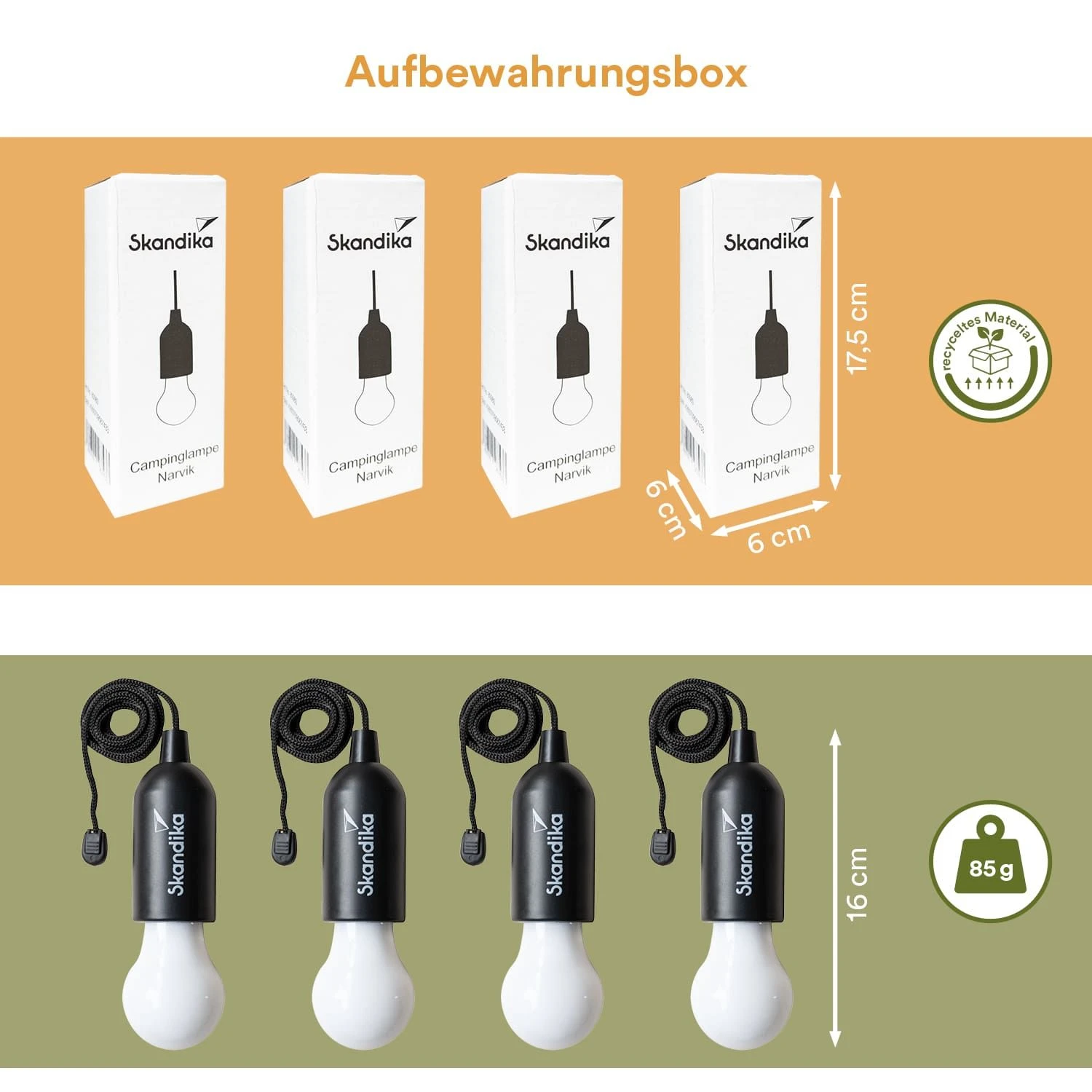 De eenvoudige lamp weegt slechts 85 g en kan overal worden meegenomen – binnenin of bevestigd aan de buitenkant van een tas of rugzak. Hij mag in geen enkele kampeeruitrusting of kofferbak ontbreken, want hij is perfect als hulpje in noodsituaties zonder stroomvoorziening. Bovendien is het echt decoratief in zijn retrostijl op het volgende tuinfeest of op het terras of balkon thuis en is het zelfs spatwaterdicht.