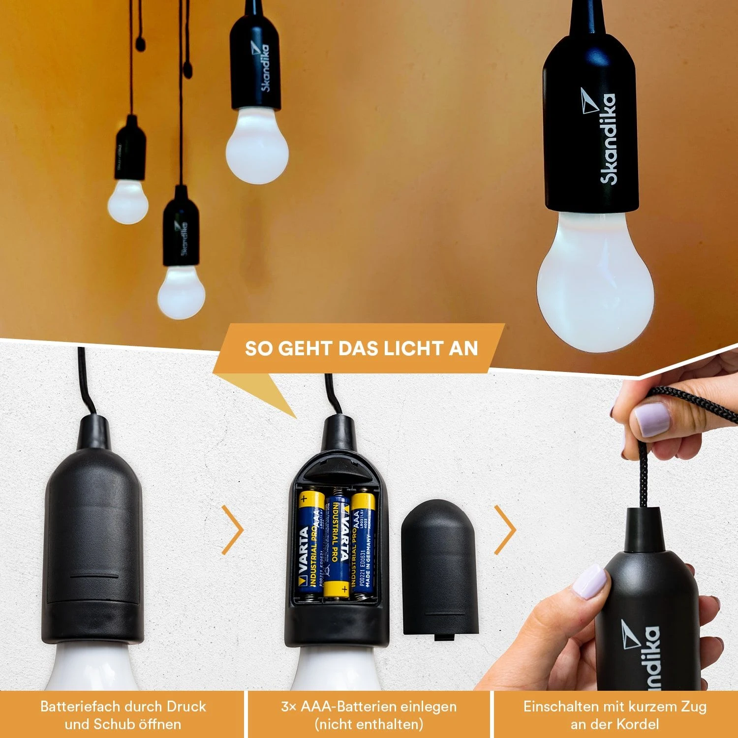 Het handige LED-lampje in gloeilamp-look werkt eenvoudig met drie AAA-batterijen en is volledig onafhankelijk van een vaste stroombron. De lamp wordt opgehangen door middel van een 100 cm lang snoer aan het bovenste uiteinde, dat op verschillende manieren kan worden bevestigd. Rechtstreeks aan een lijn geknoopt, aan een lus gebonden en aan een haak gehangen of gewoon een paar keer om een tak gewikkeld – het lange koord maakt het gemakkelijk om dit kleine lichtgevende wonder altijd en overal te gebruiken.