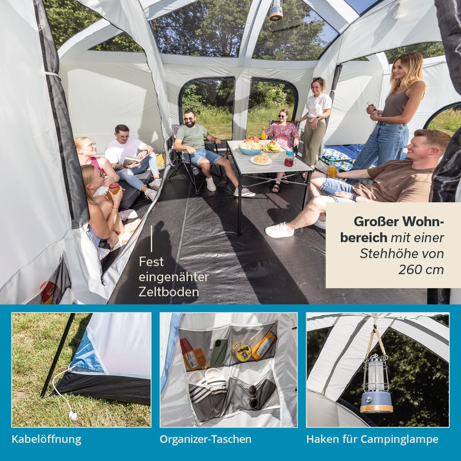 Gemak en functionaliteit staan voorop in deze droomtent. Er zijn verschillende opbergvakken in het centrale leefgedeelte en in de twee slaapgedeeltes, waardoor belangrijke kleine spullen altijd bij de hand zijn en zelfs kleine spullen netjes opgeruimd blijven. Plafondhaken bieden de mogelijkheid om campinglampen veilig op te hangen in alle ruimtes en weerbestendige kabelopeningen in de hoeken van de slaapgedeeltes zorgen voor de nodige stroomvoorziening voor mobiele telefoons, tablets etc. Het opzetten van de enorme steile wand tunneltent wordt veel gemakkelijker gemaakt door de kleurgecodeerde stokken en als de vakantie voorbij is, maakt de robuuste draagtas het vervoeren en stofvrij opbergen van de tent kinderspel.