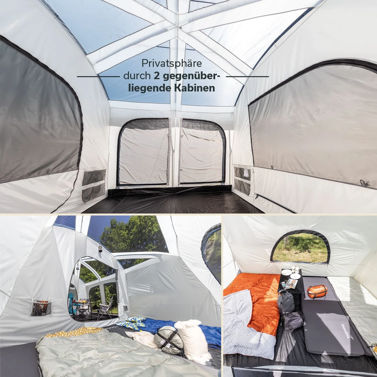 Er zijn twee grote D-deuren aan de lange voor- en achterkant van de tent, die naar het midden toe kunnen worden opgerold en stevig worden vastgemaakt. Alle vier de ingangen bestaan uit dubbele deuren met aan de buitenkant weerbestendig tentmateriaal om de binnenkant van de tent lekker droog te houden. Dankzij de binnendeuren van netstof worden insecten op betrouwbare wijze buiten gehouden, terwijl frisse lucht en licht naar binnen worden gelaten. De zijramen met halve maantjes in de achterwanden van de twee slaapgedeeltes zijn ook gemaakt van muggengaas en kunnen indien nodig van buitenaf worden gesloten om ze weerbestendig en ondoorzichtig te maken.