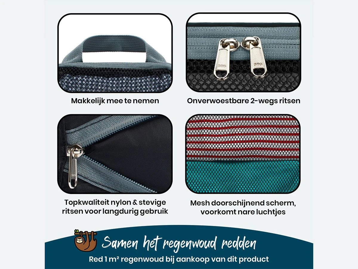 Dankzij het mesh doorschijnend scherm kun je in één oogopslag zien wat er in elke cube zit. Dit bespaart tijd en frustratie, vooral wanneer je haast hebt. Bovendien zorgt het ademende materiaal ervoor dat je kleding fris blijft, zelfs tijdens lange reizen.