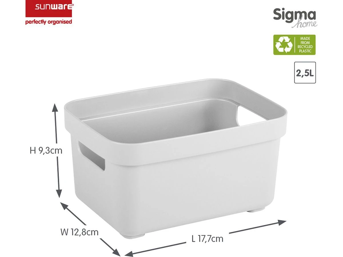 Geef je interieur een boost met onze Sigma home opbergboxen! Stijlvolle, trendy opbergboxen die gezien mogen worden. Gemaakt van gerecycled plastic en geschikt voor alle ruimtes in je huis. Dit schattige 2,5 liter boxje is ideaal voor het opbergen van bijvoorbeeld kleine spelletjes, kabeltjes of losse spulletjes die altijd op je bureau rondslingeren. Alle Sigma home opbergboxen hebben geïntegreerde handgrepen en een soft-touch look & feel. Met deksel (LOS VERKRIJGBAAR in verschillende designs) zijn ze perfect stapelbaar.