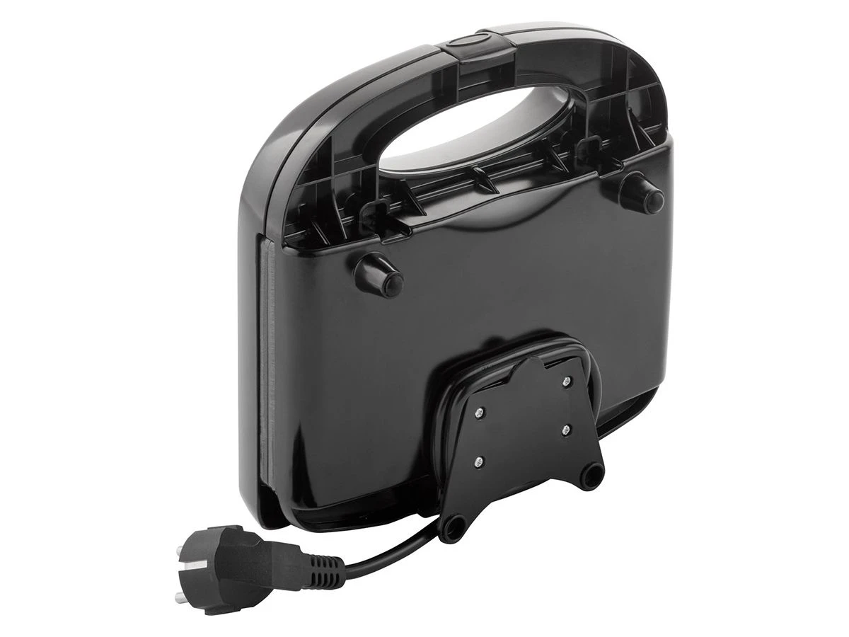 Het tosti ijzer is compact van formaat en het zwarte en zilveren design aan de buitenkant geeft een luxe uitstraling. Je kunt hem horizontaal of verticaal in de hoek opbergen zonder al te veel ruimte in beslag te nemen. Het snoer heeft ook een opbergmogelijkheid aan de onderkant van het apparaat.