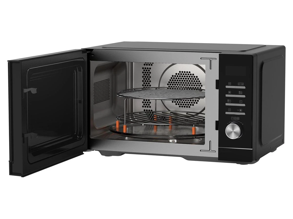Dankzij zijn zwarte design is deze magnetron een echte eyecatcher in jouw keuken. Hij heeft compacte inhoud van 23 liter, maar heeft enorm veel ruimte voor jouw gerechten. De diameter van het draaiplateau is 28,8cm. De draaideur is gemakkelijk te openen dankzij de deur open-knop.Zodra je de magnetron opent springtde LED verlichting aanwaardoor je het gerecht goed kunt zien.