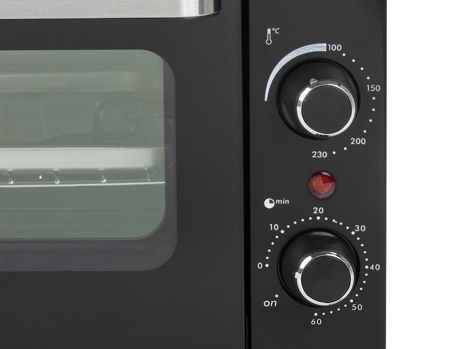 Het kleine formaat doet absoluut niet af aan de prestaties van de oven. Deze mini oven wordt geleverd inclusief een bakplaat, een grillrooster en een handvat. De regelbare thermostaat is in te stellen van 100 tot 230 graden en de timerfunctie tot 60 minuten.