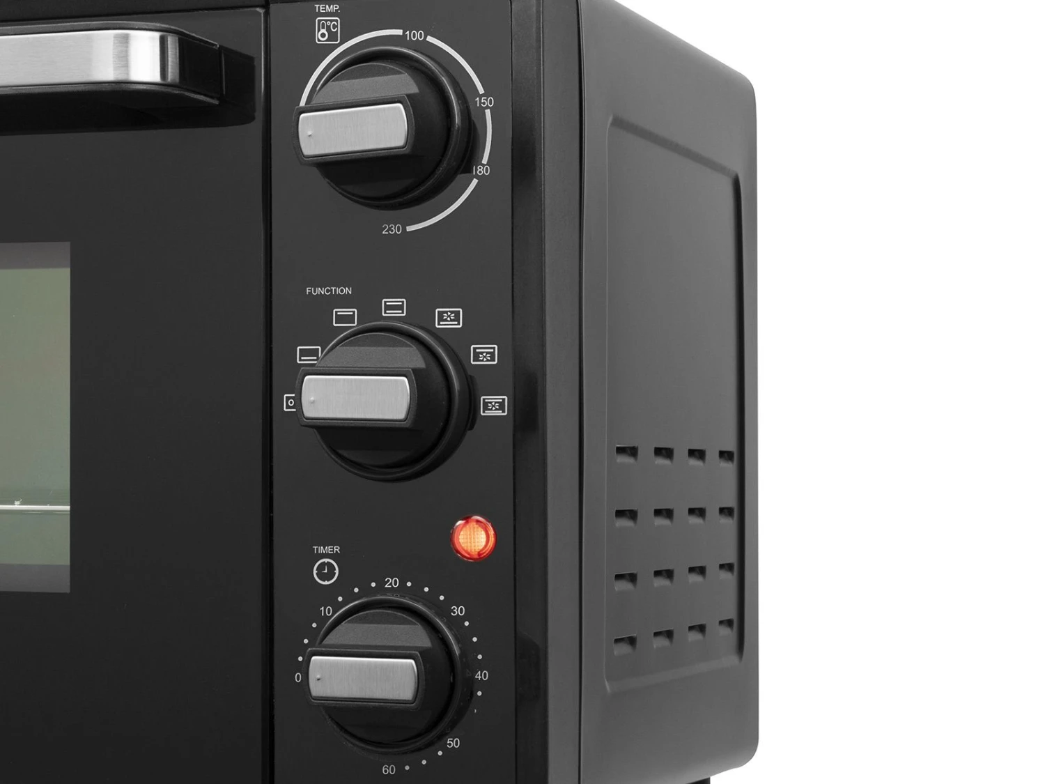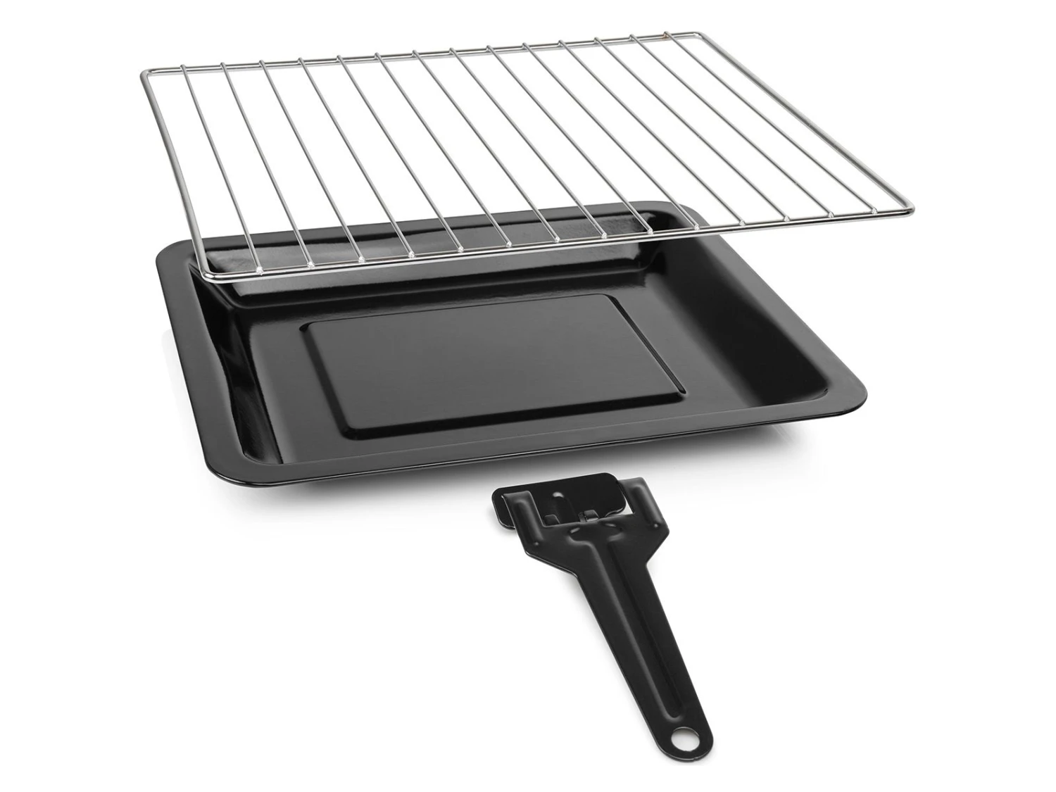 De oven beschikt over een grillplaat, bakplaat en is voorzien van een 60 minuten timer. De temperatuur is in te stellen van 90 tot 230 graden.