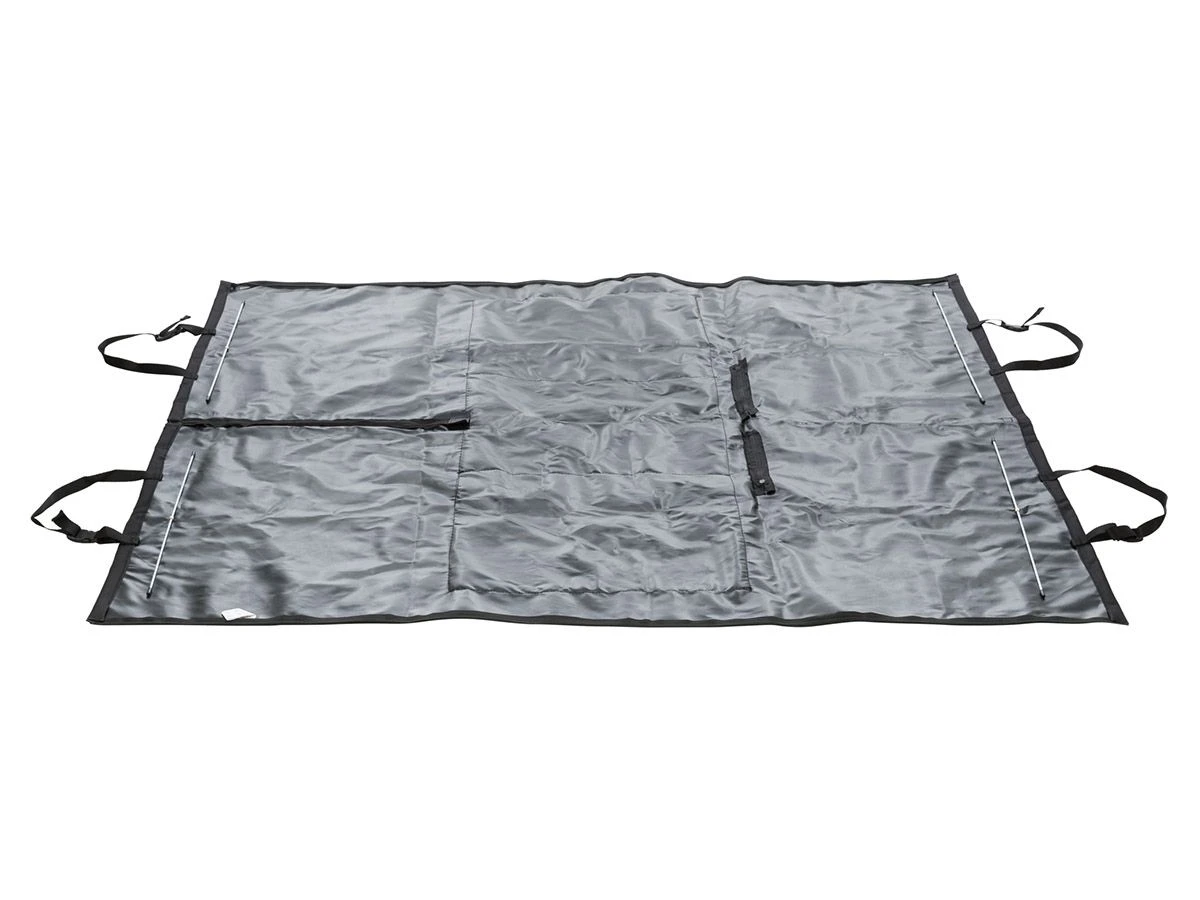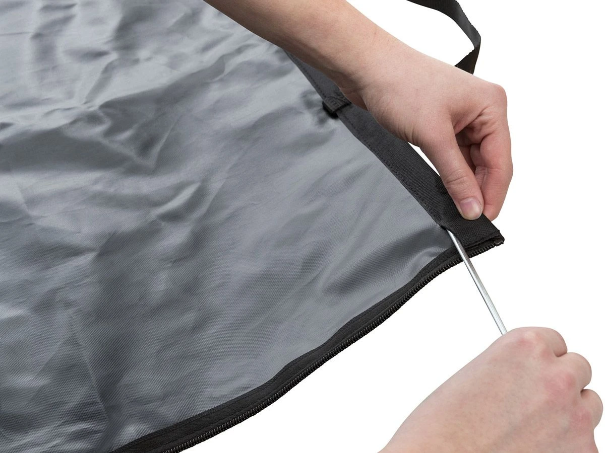 Deze beschermdeken is vormvast door de geïntegreerde metalen ribben en eenvoudig vast te zetten aan de stoelen.