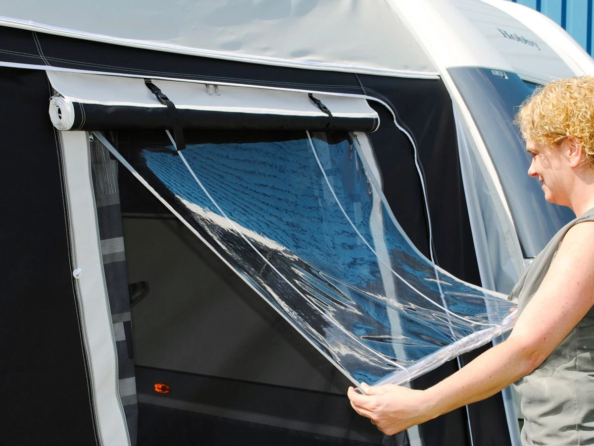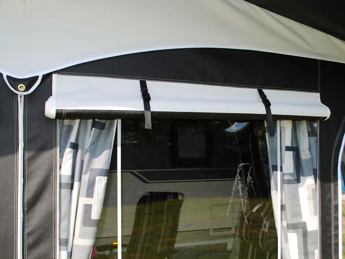 De voor- en zijwanden zijn volledig uitritsbaar, hierdoor kan het dak als luifel gebruikt worden. De voorwand bestaat uit twee panelen die onderling verwisselbaar zijn. Dit is het Walker ‘Easy-Door concept. Hierdoor kun je zelf kiezen of je de deur links van het midden of uiterst rechts plaatst. Beide zijwanden kunnen een stukje opgerold worden zodat ze als ingang gebruikt kunnen worden. Zo heb je maar liefst keuze uit 3 verschillende plekken om de voortent te betreden! Goede ventilatie is bij een PVC-voortent erg belangrijk. Daarom zit er een afsluitbare ventilatieopening in de nok onder de petluifel en zijn beide zijramen voorzien van horrengaas met een transparante afdekflap. Beide hoeken aan de voorzijde zijn voorzien van ingenaaide stormbandclips voor de optionele stormbandset.